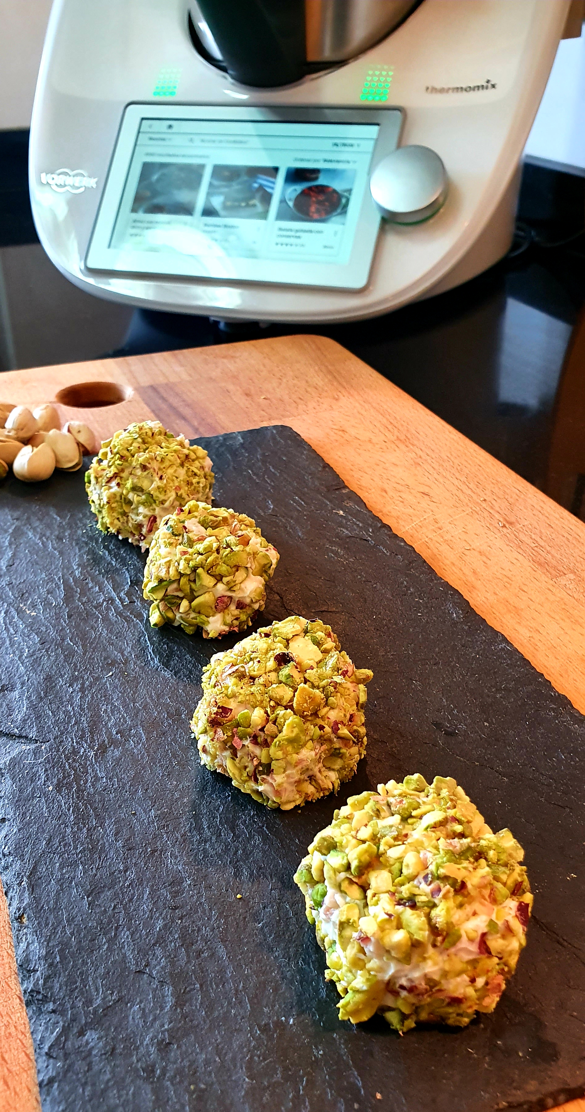 3. Añade el mascarpone, el queso cremoso, la sal y la pimienta y mezclar 10 segundos/ velocidad 4. Forma bolas rebozadas en los pistachos troceados y colocarlas en una bandeja cada una dentro de una cápsula de papel. Reserva en el frigorífico durante un mínimo de una hora y sirve